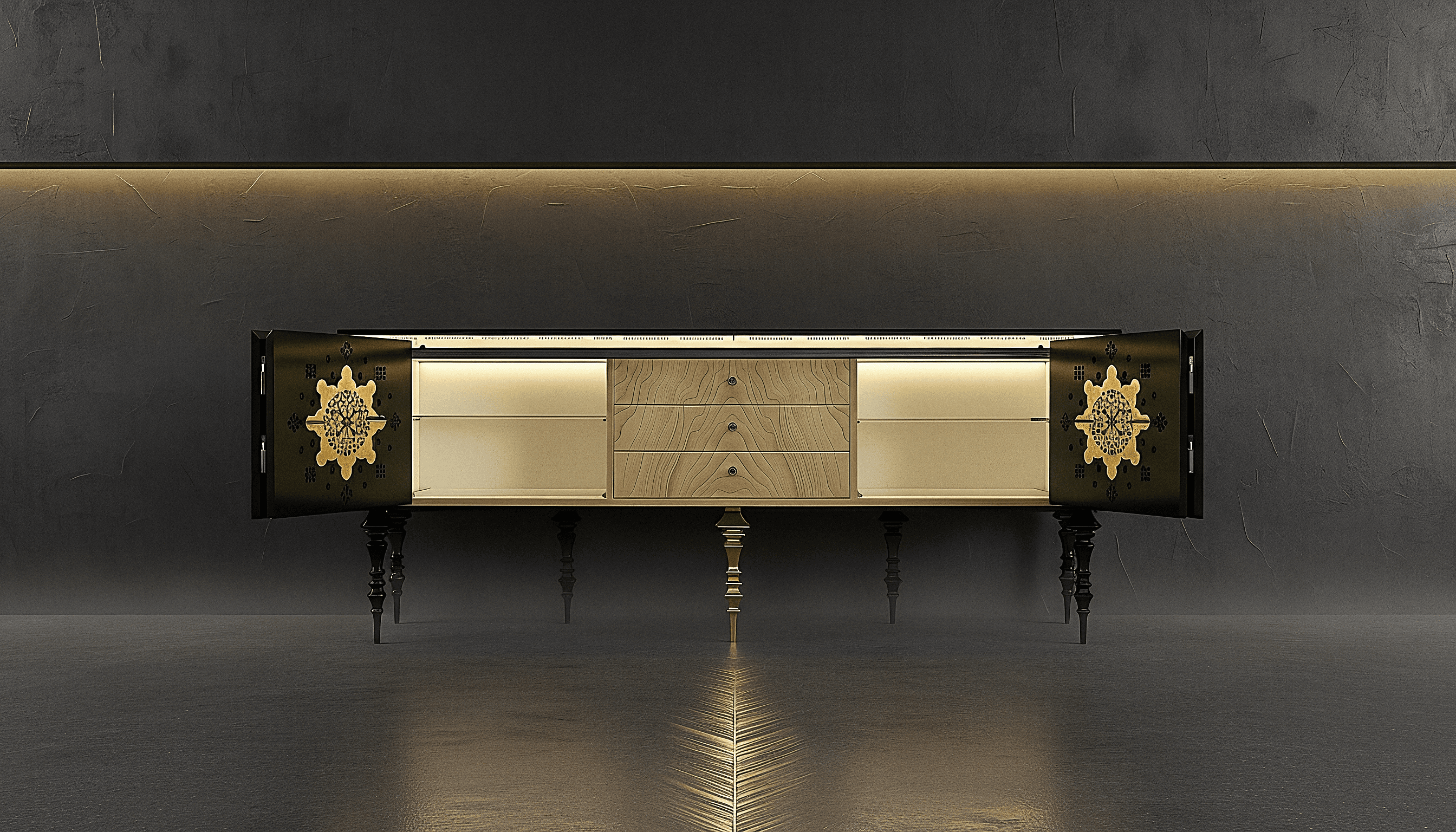 The exterior is deep and restrained, designed to hold space like a black velvet stage. Then the doors open — softly, like wings — and the piece reveals a warmer world within: calm compartments, clean order, and rich wood tones that feel collected over time. Brass details bring a noble glow, and the ornament reads like echoes of shields, manuscripts, and armour — used here as design language, not mysticism.